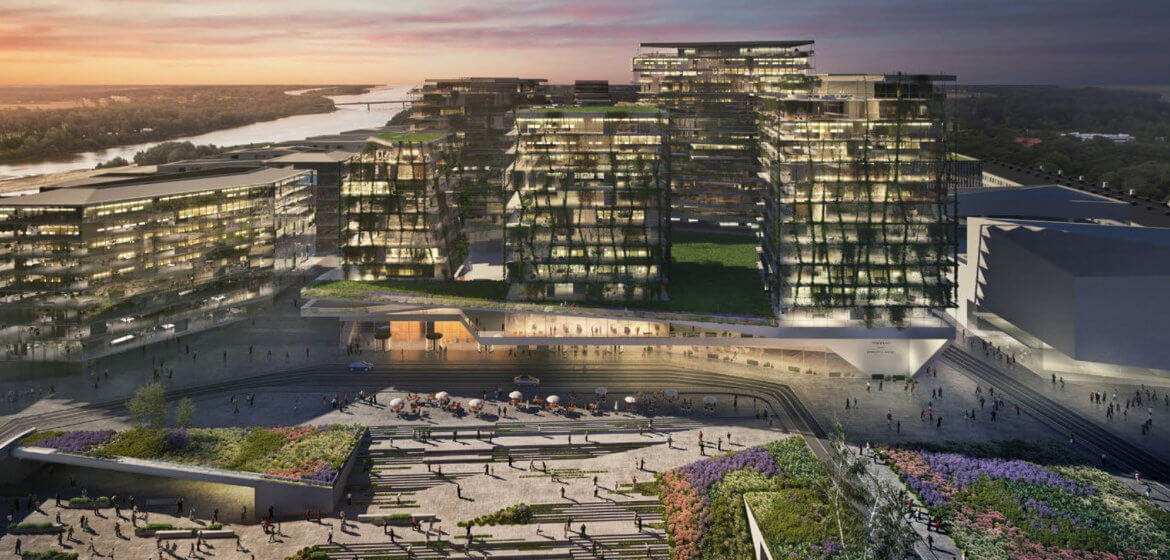 Jest, też część przeznaczona dla firm. Przestrzeń biurowa składać się będzie z trzech budynków, które pomieszczą 6500 pracowników. Warto wspomnieć, że budynki spełnić mają standardy zrównoważonego budownictwa – certyfikaty BREEAM i LEED.
